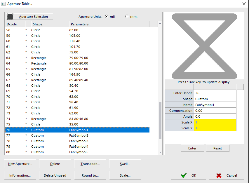 Symbols: 1. You can adjust the scale of symbols in the aperture table after you've created the fab drawing. See below screen shot. 2. You can create your own symbols and save them out as a custom aperture file. Name the custom aperture file "FabSymbols.cap" and place it here: Numerical Innovations/Fab3000V8/symbols