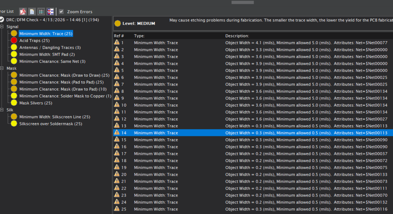 When viewing your sample screen capture, it appears there many instances of trace widths (on the Signal layers) that are well below minimum width allowed (5 mil / 0.127mm). Those Traces in the DFM Error List have a width of (0.3 mils / 0.0076mm). It's possible those thin copper traces are either: